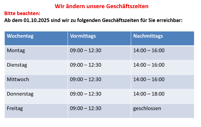 26.09.2025 Kundeninformation26.09.2025Aufgrund einer Betriebsveranstaltung bleiben unser Kundencenter und der technische Service am Donnerstag, den 02.10.2025 geschlossen.Mehr
